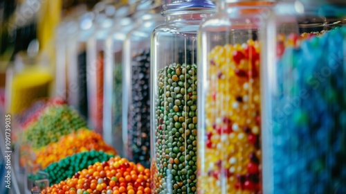 Assorted spices and legumes in glass jars on display