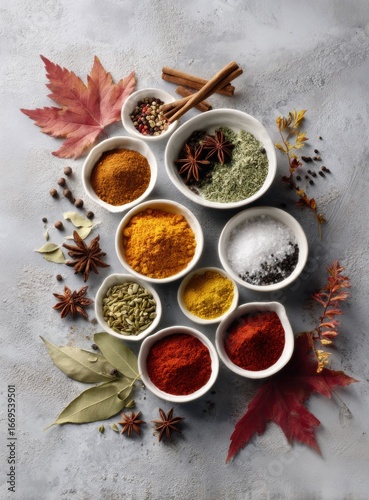 Assorted spices in small bowls, arranged with autumn leaves on a textured surface. Warm colors and natural light create a cozy, inviting scene
