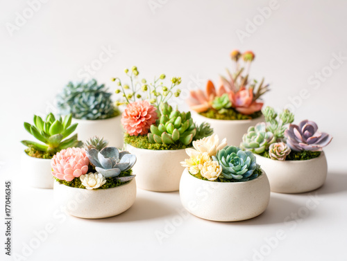 Assorted succulent plants in minimalist white pots for modern decor