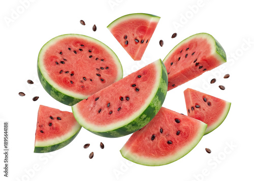 assorted watermelon pieces and seeds floating against a black backdrop