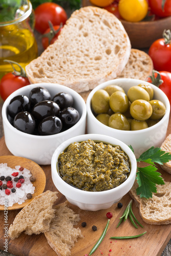 assortment of antipasti - olives, pesto and bread, vertical