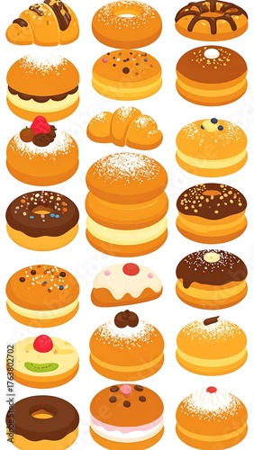 Assortment of baked pastries and donuts with various toppings