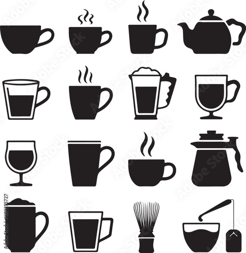 Assortment of black silhouette icons depicting cups mugs and teapots for hot beverages coffee