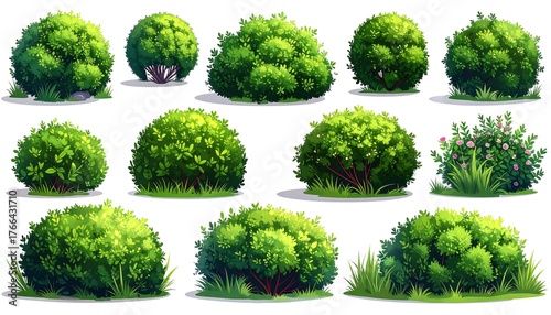 Assortment of cartoon-style bushes with varying shapes and foliage