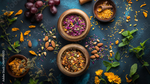Assortment Of Fresh And Dried Seasonings And Herbs On A Marble Background: A Vibrant Display Of Culinary Essentials
