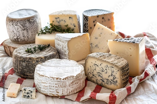 Assortment of gourmet cheese on white background with sprigs of thyme.