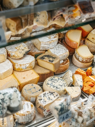 assortment of several cheeses display on a counter meticulously organized on a supermarket shelves
