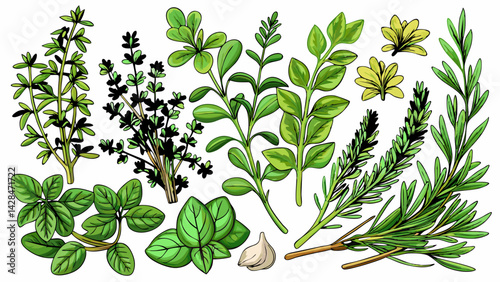 Assortment of thyme and stevia sprigs displayed on a plain surface on white background