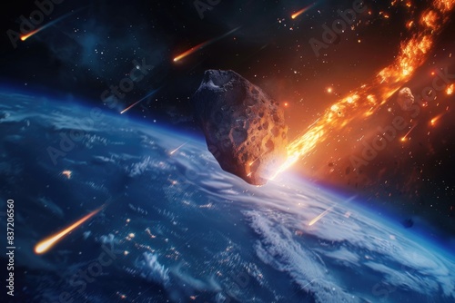 Astonishment asteroid flying past earth in space with fiery meteor.