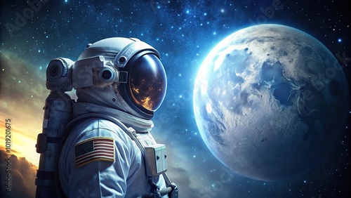 Astronaut gazing at moon in starry sky