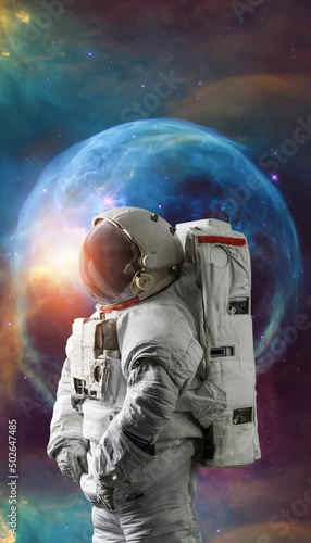 Astronaut in space. Galaxy and Nebula space art. Vertical 16:9 wallpaper with spaceman. Elements of this image furnished by NASA