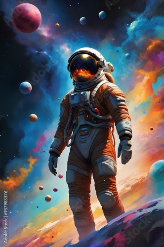 Astronaut in Spacesuit on Rocky Terrain Against Cosmic Backdrop