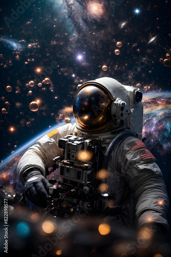Astronaut in the space wearing Extravehicular Mobility Unit, or EMU, looking in to the space, world world astronaut day, world space day