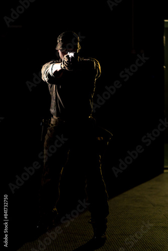 at a professional shooting range military ammunition trainer stands aiming a pistol