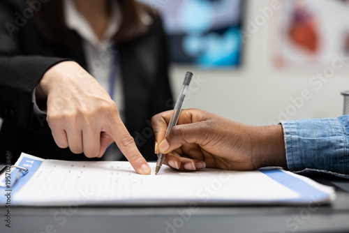 At hospital reception counter, secretary assists black patient with signing medical form on clipboard. Receptionist provides guidance for health insurance paperwork during clinical appointment.