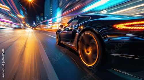 At night, a car rushes along a city road, creating light lines of motion. Illustration for banner, poster, cover or presentation.