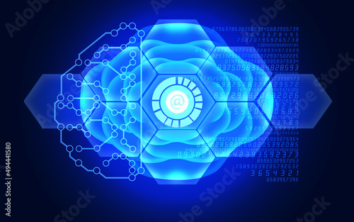 At Symbol is Reflecting Over Futuristic Electronic Circuit in 3D Brain Symbol