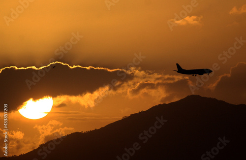 Atardecer con el sol ocultándose mientras un avión va en vuelo en Panamá