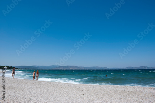Athens, Greece, August 2020: Beautiful pebbled beach and stormy sea waters