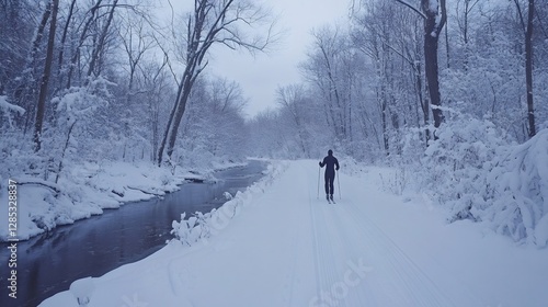 Athlete practicing cross-country skiing near a river in a snowy forest