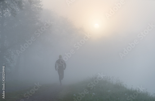 Athlete running on a gravel road during a foggy, spring sunrise in the countryside.