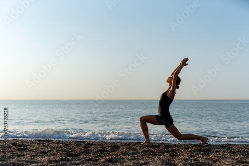 Athletic woman doing yoga lunge pose at sunrise on a peaceful beach