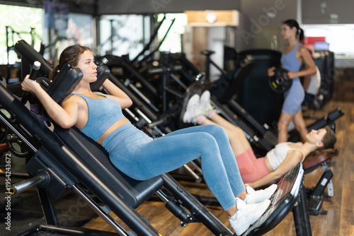 Athletic woman in top and leggings doing exercises in hack squat machine. Young woman training glutes in the gym