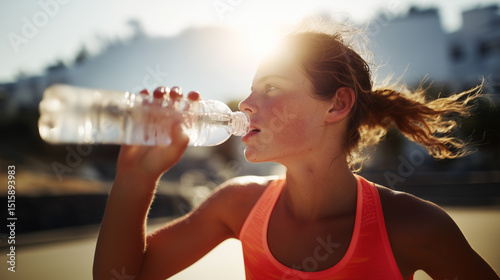 Athletic young woman drinking water under hot sun, rehydrating after workout, symbolizing extreme heat, dehydration risk, and importance of staying hydrated during summer activities.