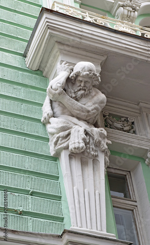 Atlant - balcony support, an element of the decor of the apartment building of the house of the Merchant Society of Moscow. The house was built in 1890 by architect Boris Freidenberg. Russia, Moscow,