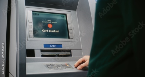 ATM User Entering PIN Code on ATM Keypad for Money Withdrawal. Error Message on Cash Machine Screen About Cancelled Transaction Due to Blocked Card. Cash Transactions, Banking System. Close Up Shot.