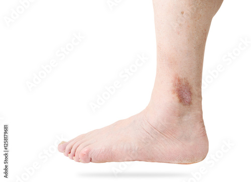 Atopic dermatitis (AD), also known as atopic eczema on leg isolated on white background.