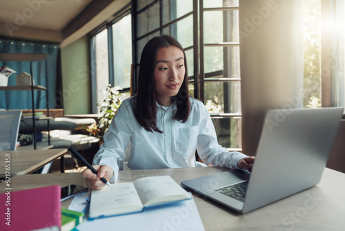 Attractive asian businesswoman working on laptop and making notes at modern office