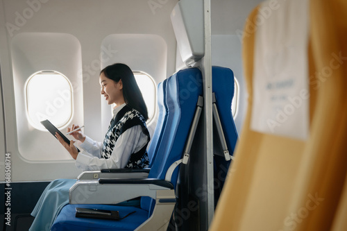 Attractive Asian female passenger of airplane sitting in comfortable seat while working laptop and tablet with mock up area using wireless connection.