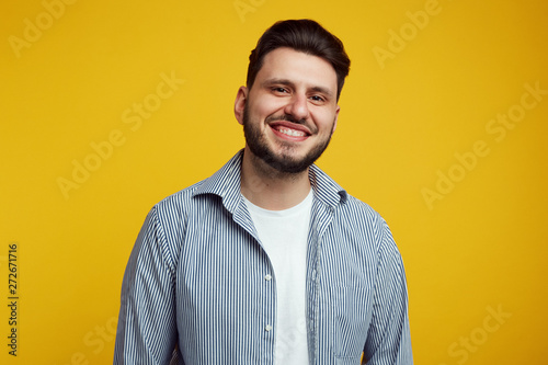 Attractive bearded young man laughing out loud, smiling broadly, showing his white straight teeth against yellow background