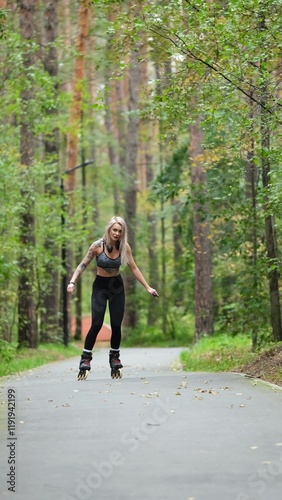 Attractive blonde feels free and light while rollerblading in city park in summer. Stunning Caucasian woman with beautiful figure uses roller skates for outdoor sports.