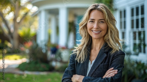 attractive Caucasian female real estate agent standing in front of new home white color with arms crossed and smiling for the camera.