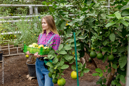 attractive charming girl picked lemons for sale. close up side view photo. copy space