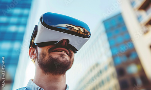 Attractive man wearing virtual reality glasses outdoor, Smartphone with VR headset, future technology concept.
