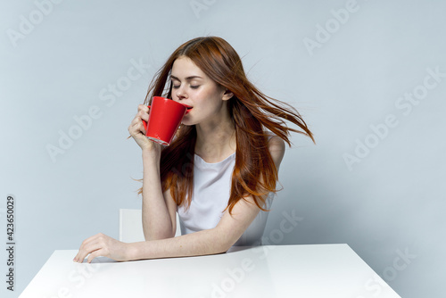 attractive red-haired woman drinking from a red mug while sitting at the table