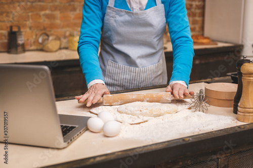 Attractive senior aged woman is cooking on kitchen. Grandmother making tasty baking. Using laptop. Close-up food concept.