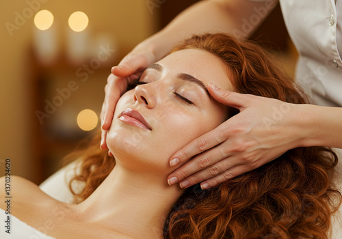 Attractive woman enjoying face massage, closeup. Beauty procedure