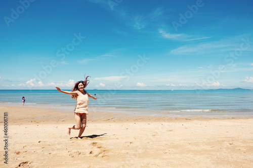 attractive woman on beach. Summer holiday fashion concept woman wearing sun hat at the beach on sand shot from above Happiness sexy girl at sunset time. summrer travel or vacation concept.