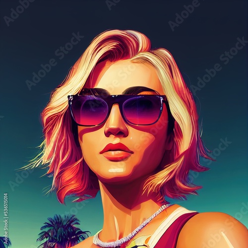 Attractive young girl painting, 90s art style. Middle age woman, character portrait, digital modern poster detailed image. Watercolor or acrylic style. 3D illustration