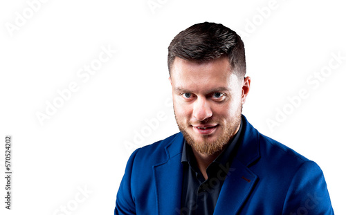 Attractive young guy posing in studio. Portrait of a handsome man with light beard and nice face. Confident look to the camera. Horizontal portrait