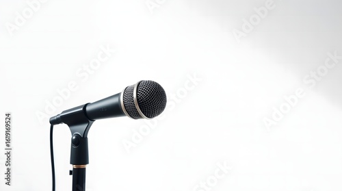 Audio recording equipment featuring a classic black microphone on a stand isolated on a bright white backdrop with copy space.