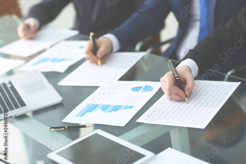 Audit concept at working with plan and analyzing investment charts at workplace