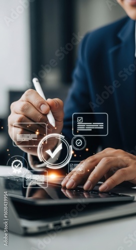 Augmented reality in business efficiency. Digital approval with stylus and tablet. Modern office tech with floating checkmark.