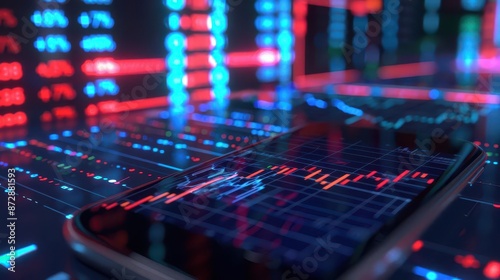 Augmented reality screen with declining stocks and bankruptcy alert, copy space for text,