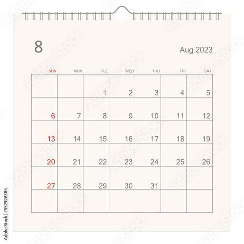 August 2023 calendar page on white background. Calendar background for reminder, business planning, appointment meeting and event. Week starts from Sunday. Vector illustration.