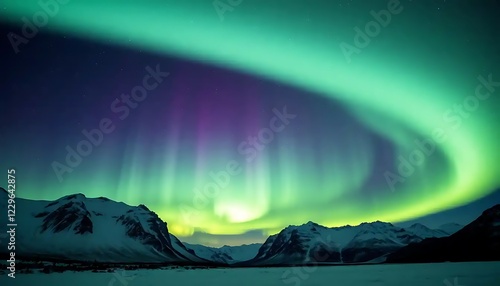 Aurora Borealis Display Over Snowy Mountains